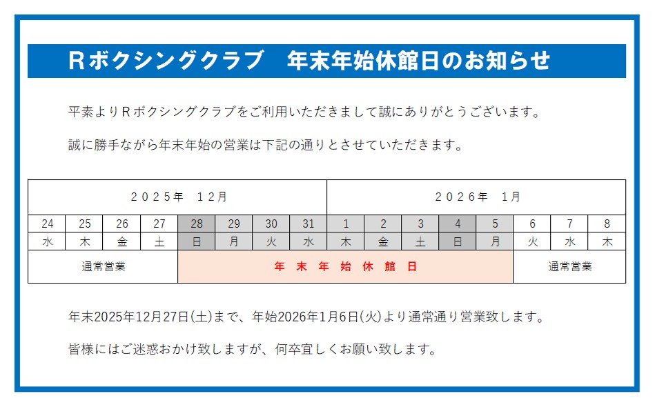 年末年始休館日のお知らせ 2025年12月11日 最終更新日時 : 2025年12月11日 admin_web 誠に勝手ながら年末年始の営業は下記の通りとさせて頂きます。年末2025年12月27日(土)まで、年始2026年1月6日(火)より通常通り営業致します。なお、ボクシングスクールの練習会は期間中別途開催します。詳しい日程はスタッフにお問い合わせ下さい。 インスタはこちら!